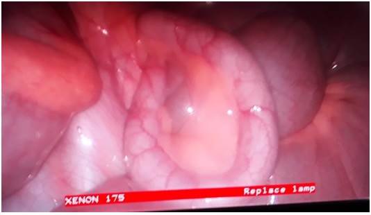 Al movilizar el anejo derecho se define un quiste de aproximadamente 7 cm ubicado en el fondo del saco de Douglas, torcido, pediculado con coloración violácea originado de la trompa de Falopio derecha y a la vez torcido sobre la porción libre de esta (Figura 4-b). Ovario derecho, anejo izquierdo y resto de la cavidad abdominal normal.