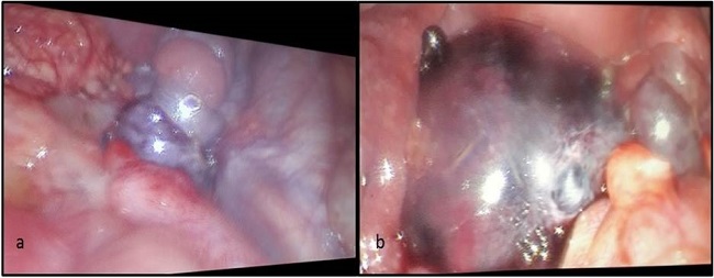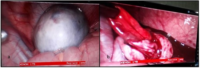 A través de dos puertos accesorios de 5 mm y 10 mm en fosa ilíaca izquierda y derecha respectivamente, se procede a la cirugía; con punción y aspiración de 300 ml de un contenido claro del quiste, del cual se toma muestra para estudio; desteche y enucleación de todo el quiste y hemostasia posterior del parénquima ovárico sano (Figura 3-b). Apendicectomía asistida por vía laparoscópica.