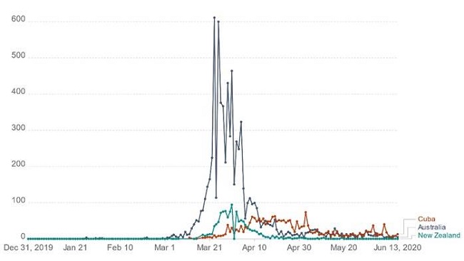 La epidemia se presentó en momentos diferentes en los tres países, la primera en reportar casos fue Australia, el 25 de enero, Nueva Zelandia, 36 días después y 46 días posteriores en Cuba. Este tiempo sin casos en Cuba y Nueva Zelandia fue un período importante para aprender de otros y establecer a tiempo una estrategia de control.
