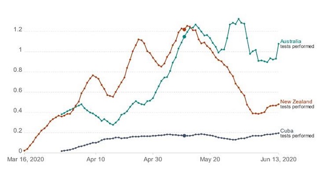 Los test realizados por Australia alcanzaron la cifra de 69,91 por 10 000 habitantes, con un 0,4 % de positividad, Nueva Zelandia alcanzó los 36 por 10 000, con 0,7 % de positividad y Cuba 12,16 por 10 000, con 1,7 % de positividad. Los tres países sobrepasan la recomendación de la OMS: no tener más de 10-12 % de positividad y en la medida de lo posible garantizar que la positividad no supere el 2 % para operar en zonas de mayor confort, que es la de control.