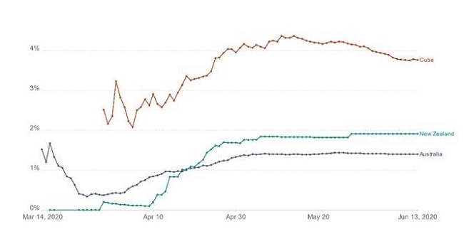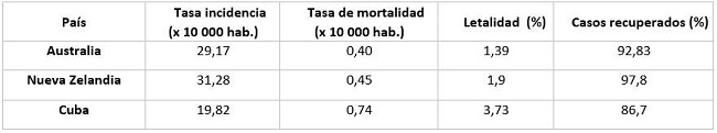 Results: Australia had 7,283 cases of which 6,888 (94.48%) patients recovered. They performed 1,782,651 diagnostic tests (69.91 per 10,000 inhabitants) and the positivity was 0.4%. They reported 102 deaths with higher rates in people aged 70 - 89 years, and a case fatality of 1.39%. New Zealand reported 1,515 cases, with 1,483 recovered (97.8%) and 22 deaths. They performed 310,297 (36 per 10,000 population) PCR tests, with 0.7% positive cases. The case fatality was 1.9%. Cuba accumulated 2,238 cases and 1,923 (86%) recovered. A total of 84 patients died, with a lethality of 3.75%. PCR tests (12.16 x 10,000 inhabitants) were performed reporting 1.7% of positive cases.