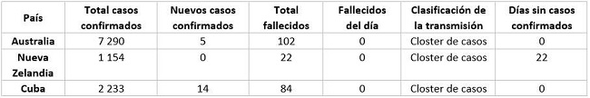 Introduction: COVID-19 is a viral respiratory disease produced by SARS-CoV-2. The first cases were diagnosed in Wuhan, China in December 2019; then the disease became a pandemic. The WHO declared it a global emergency on January 30, 2020. General data on the epidemic in Cuba, Australia and New Zealand are presented.