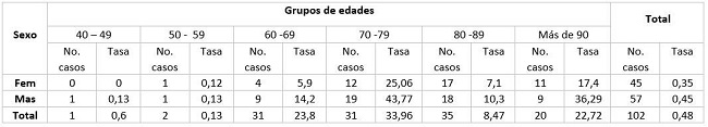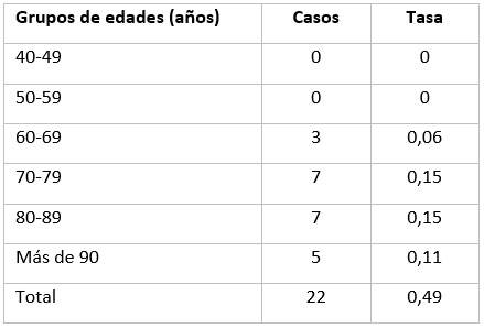 Las edades más afectadas en la mortalidad fueron los mayores de 60 años, aunque, se presentaron defunciones en un rango de edades entre los 42 y los 96 años. Las tasas más elevadas correspondieron al grupo de 70 - 89 años, seguida de los mayores de 90 años; la tasa de mortalidad general fue de 0,48 por 100 000 habitantes (Tabla 2), por sexo fallecieron más hombres (56 %), que mujeres (44 %).11