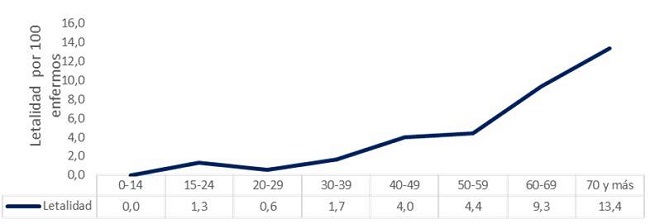 En relación con la edad, la letalidad por TB con virus de inmunodeficiencia humana negativo presenta un incremento desde el grupo de edades de los 30-39 años. Sin embargo, el grupo más vulnerable es de 60 años y más. (Figura).