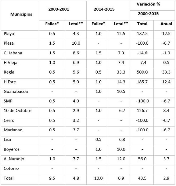 En la provincia, esta investigación es factible pues las cifras de autopsias son elevadas10 en comparación con la literatura internacional y el registro de estadísticas vitales es de calidad, pues las tasas de mortalidad son confiables.11 La letalidad como indicador que evalúa la calidad de la atención médica se convertiría en un indicador importante para la vigilancia en la etapa de eliminación de la enfermedad.