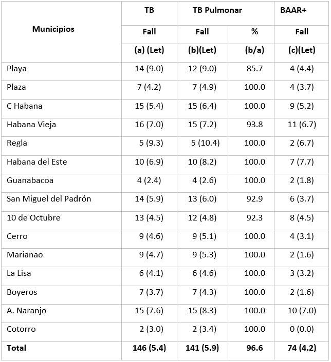 La TBP representó 96.6% de los fallecidos. El incremento de la letalidad en los fallecidos con TB pulmonar y BAAR+ por encima de la media nacional corresponde a los municipios Playa, Centro Habana, Habana Vieja, Regla, Habana del Este y Arroyo Naranjo. (Tabla 4).