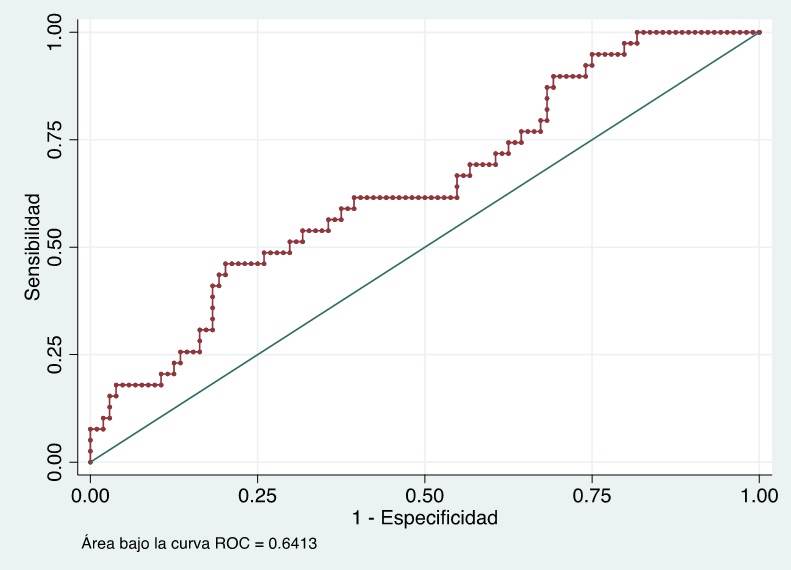 En la curva ROC, se encontró un área bajo la curva de 64,13 % IC95 (54,03-74.22), lo que significa que existe 64,13 % de probabilidad que el diagnóstico de pérdida ponderal excesiva sea más correcto que el de un neonato sano, cuando son elegidos al azar. (Figura 1).