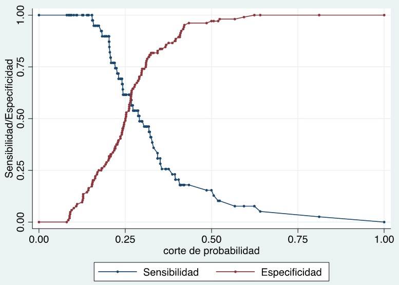 De acuerdo con la curva de Sensibilidad/Especificidad se determina el corte de probabilidad de 0,29, permite determinar el punto de corte con mayor sensibilidad y especificidad de variación de peso a las 24 horas en 5,47 %. (Figura 2).