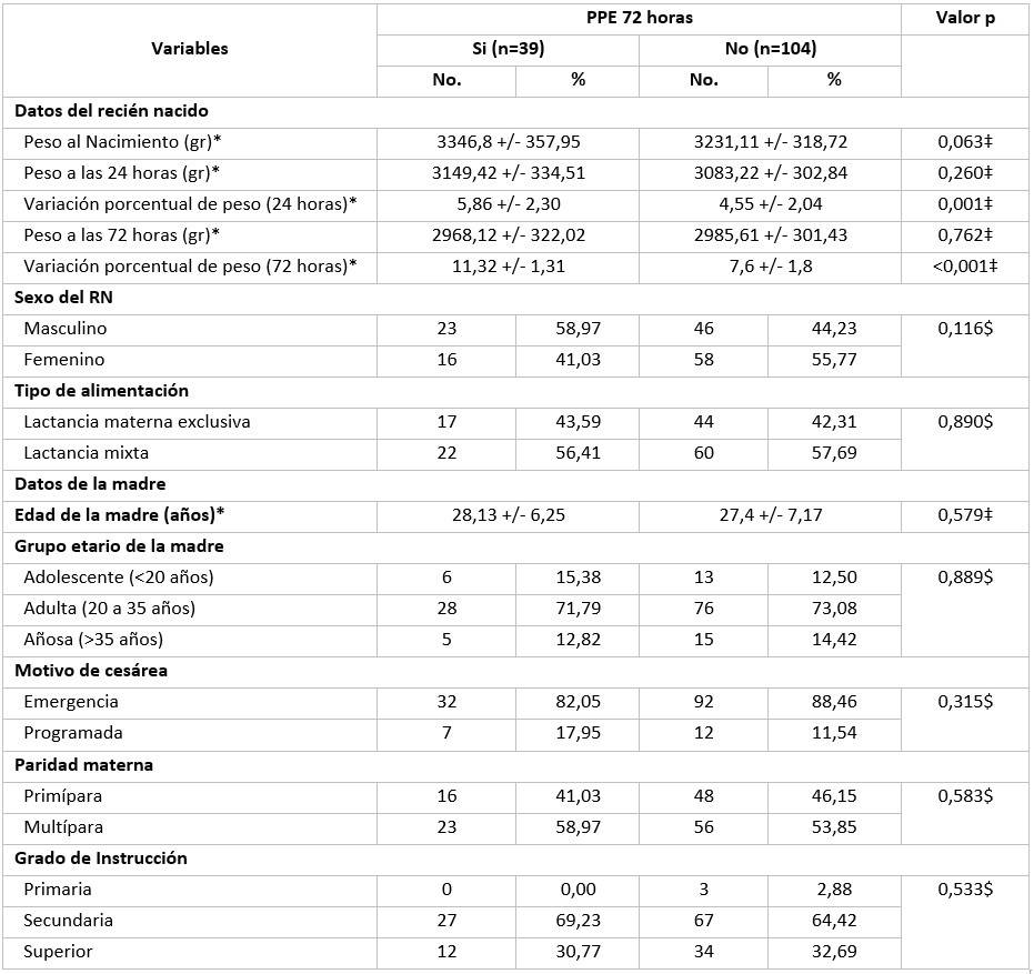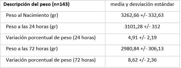 Se incluyeron los datos de 143 neonatos sanos. El peso promedio al nacer fue de 3262,7 gr (± 332,6); la variación porcentual de peso a las 24 y 72 horas fue 4,9 % y 8,6 %, respectivamente; y la pérdida ponderal excesiva se evidenció en 39 (27,3 %) recién nacidos. (Tabla 1).