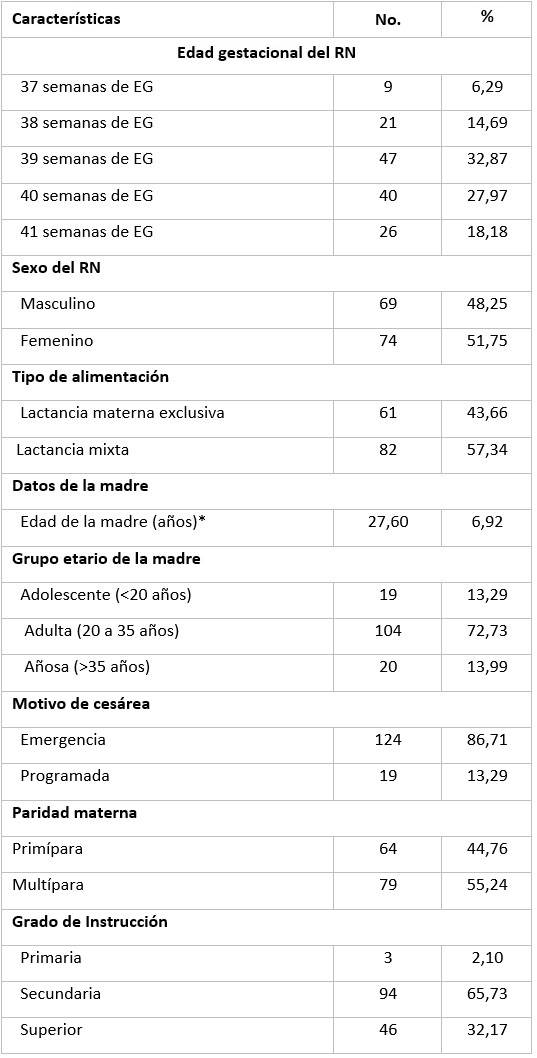 Se incluyó en el estudio a los recién nacidos a término (edad gestacional mayor o igual a 37 semanas y menor a 42 semanas), nacidos por cesárea (se consideró a la cesárea primaria, reiterativa, electiva por cesárea anterior, desproporción cefalopélvica o distocia de presentación, sufrimiento fetal sobre diagnosticado, ruptura de membranas intraparto de 0 a 12 horas de evolución y/o distocias dinámicas del parto), neonatos con peso al nacer entre 2 500 gramos y 4 000 gramos, neonatos que se encontraron en alojamiento conjunto y con APGAR mayor o igual a 7 al primer minuto y a los 5 minutos. Se excluyeron aquellos neonatos que estuvieron hospitalizados en las Unidades de Cuidados Intensivos o Intermedios, aquellos con altas precoces antes de las 72 horas en madres post cesárea, embarazo múltiple, recién nacidos con patologías al momento de nacimiento con repercusión en la pérdida de peso o repercusión clínica como malformaciones cardíacas. De un total de 167 neonatos, fueron excluidos 24 debido a no cumplir con los criterios de inclusión y por no contar con los datos necesarios para la investigación.