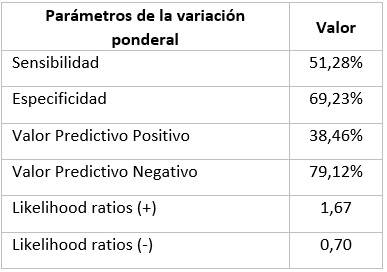 Dentro de las limitaciones, no se contó con un grupo control y la población fue limitada; sin embargo, se realizó una prueba de sensibilidad para poder encontrar el punto de corte idóneo para predecir la pérdida ponderal excesiva, similar a un estudio previo.8