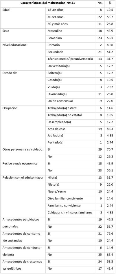 Una vez identificados los presuntos maltratadores por los ancianos, se procedió a entrevistarlos siguiendo la Guía del Dr. Kendon. Solo 41 accedieron a participar. Entre estos, predominó el sexo femenino (56,1 %), las edades entre 40 y 59 años (53,7 %), el nivel secundario de escolarización (51,2 %) y como estado civil, el estar divorciado (26,8 %). En su mayoría, se trataba de hijo(a)s (31,7 %), amas de casa (46,3 %), con más de una persona a su cuidado (70,7 %) y sin recibir ayuda económica externa (56,1 %). El 46,3 % refirió antecedentes patológicos personales, mayormente Hipertensión Arterial (84,2 %). El consumo de sustancias psicoactivas fue identificado en 75,6 % de los individuos. Las más utilizadas eran: café (96,8 %), cigarrillos (77,4 %), psicofármacos (sin prescripción médica) (58,1 %) y alcohol etílico (48,4 %). El 58,5 % refirió antecedentes de atención por Salud Mental, mayormente debido a trastornos depresivo-ansiosos. (Tabla 3).