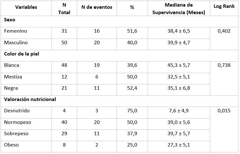 Al analizar la supervivencia de los pacientes teniendo en cuenta cada factor estudiado de manera individual se obtuvo que el sexo y la raza no tuvieron un impacto significativo sobre la misma; sin embargo, si lo tuvo la desnutrición, con una mediana de supervivencia mucho menor que el resto de los estados nutricionales. (Tabla 1).