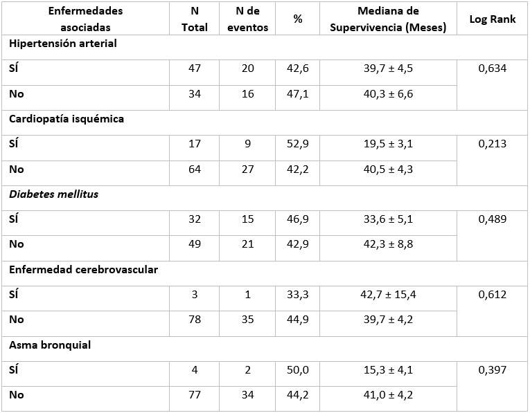 La cardiopatía isquémica y el asma bronquial fueron las enfermedades de mayor impacto en la supervivencia, pero sin significación estadística. (Tabla 2).