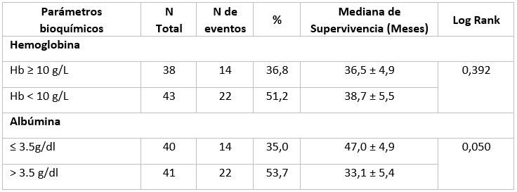 La albúmina fue el parámetro bioquímico estadísticamente significativo en relación con la supervivencia. (Tabla 3).