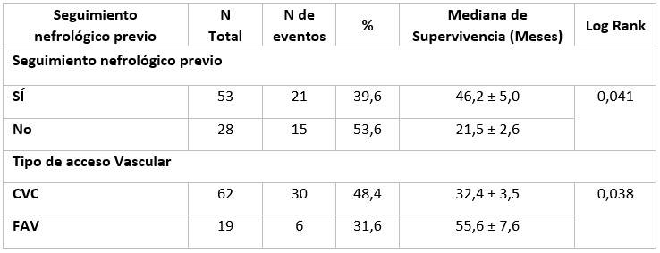 El seguimiento nefrológico previo y el tipo de acceso vascular mediante fístula arterio-venosa al inicio en hemodiálisis impactaron significativamente en la supervivencia. (Tabla 4).