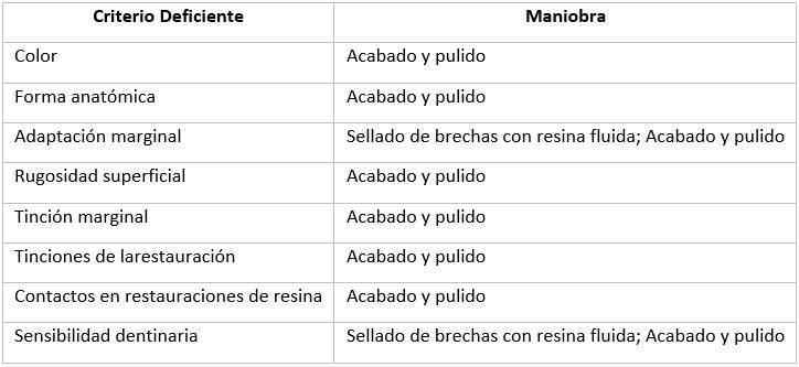 Reacondicionamiento de restauraciones de resina en base a los Criterios RYGE/USPHS y se realizaron los procedimientos en base al criterio deficiente. (Tabla 1).