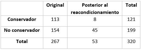 Donde la elección de 113 tratamientos fueron conservadores originalmente y siguieron siéndolo después de la reparación de la restauración. La elección de 8 tratamientos fueron conservadores originalmente y posterior a la reparación fueron no conservadores. Además 154 tratamientos no eran conservadores originalmente y después sí lo fueron y 45 elecciones de tratamiento fueron no conservadoras y siguieron sin serlo posterior a la reparación de las restauraciones. (Tabla 2)