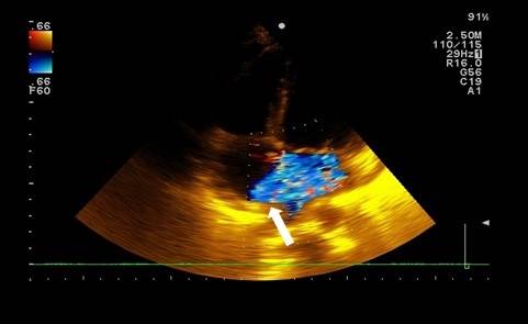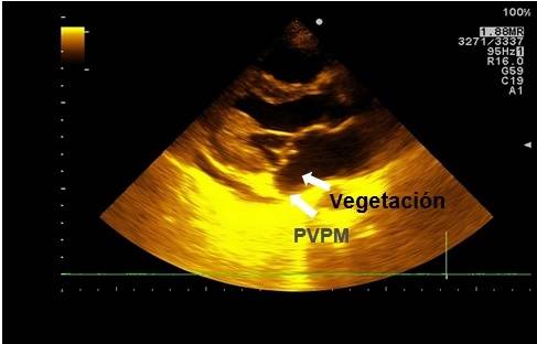 Ecocardiograma de urgencia: área de la aurícula izquierda: 20,6 mm (limítrofe). Aparato valvular mitral: prolapso de válvula mitral, valva anterior y posterior, con regurgitación que ocupa toda la aurícula izquierda hasta el techo de la misma. (Figura 1) Múltiples vegetaciones en cara auricular de valva posterior de válvula mitral, la mayor de 7 x 3 mm. (Figura 2) Derrame pericárdico ligero. Conclusiones: Endocarditis infecciosa, prolapso valvular mitral e insuficiencia mitral severa.