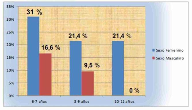 El Figura 1 ilustra cómo estuvo constituida la muestra respecto a la edad y el sexo. En el grupo de 6-7 años, 31 % lo constituyó el sexo femenino y 16,6 % pertenecía al sexo masculino. En los grupos de edades de 8-9 años y de 10-11 las féminas representaron 21,4 % de la muestra respectivamente y los varones de 8-9 años constituyeron 9 % de los succionadores digitales, no existiendo ningún varón en la edad de 10-11 con este hábito.