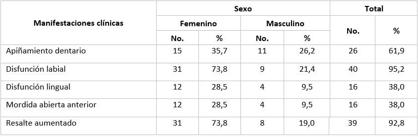 Resultados: Los niños entre 6 y 7 años fueron 47,6 % y el sexo femenino, 73,8 %. Dentro de las anomalías dentomaxilofaciales, la disfunción labial se presentó en 95,2 % y el resalte aumentado en 92,8 %. El 83.3 % de los niños finalizaron con un conocimiento adecuado. El 78,6 % abandonó el hábito.