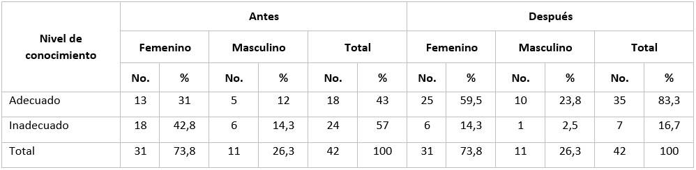 En cuanto al nivel de conocimientos y su relación con el sexo, los datos obtenidos coinciden con lo presentado por Haces,12 González13) y Laborde,8 pues se aprecia un predominio de conocimientos inadecuados en ambos sexos antes de la intervención y la consiguiente modificación de conocimiento después de realizada esta, en mayor medida en el sexo femenino.