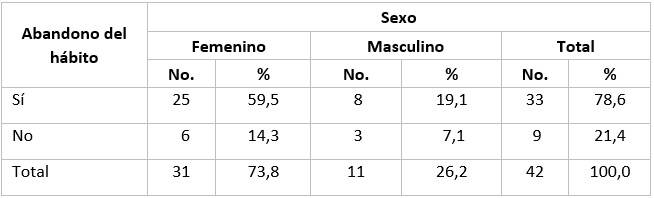 La Tabla 3 muestra que en el sexo femenino, 59,5 % abandonó el hábito y 14,3 % no lo logró. En varones, 19,1 % lo abandonó contra 7,1 % en el que no fue posible eliminarlo. Estas proporciones pueden sugerir la posibilidad de que exista relación entre abandonar el hábito y el sexo. Por el elevado valor del p-valor (α = 0.05) para esta muestra se verifica independencia entre sexo y abandono del hábito