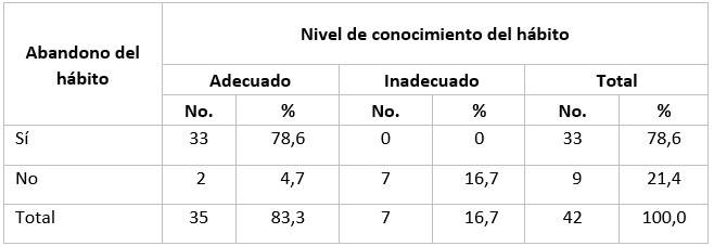 En la Tabla 4, se puede observar que 83,3 % finalizaron el estudio con un conocimiento adecuado. El 78,6 % abandonó el hábito y tuvo nivel de conocimiento adecuado después de la intervención. Al final, 16,7 % no abandonó el hábito y mantenían niveles de conocimientos inadecuados y lo abandonaron 33 casos para 78,6 %.