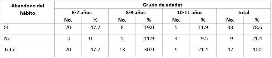 Se destaca en la Tabla 5 que los 20 niños en las edades menores de 6-7 años abandonaron el hábito. El 47,7 % del total que lo abandonó pertenecía al grupo de 6-7 años; 19 % de 8-9 años y 11,9 % en el grupo de10 y 11 años.