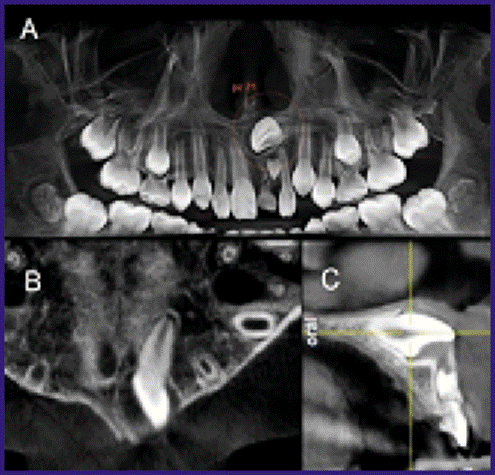 El especialista posee distintos recursos para diagnosticar de manera precoz la retención dental. Uno de los estudios más utilizados y confiables es la tomografía computarizada Cone-Beam (TCCB) por la posibilidad de mostrarnos imágenes de alta resolución en las tres dimensiones del espacio del complejo craneofacial y proporcionar mediciones precisas de los parámetros angulares, lineales y de la reabsorción radicular.9 Un incisivo impactado que cambia de posición en proceso de formación radicular también cambia su dirección de erupción, puede hasta invertirse, la corona contactar con el hueso cortical del piso de las fosas nasales o hasta erupcionar en fosa nasal y causar irritación, secreción y estenosis nasal10,11 y si la raíz de este diente en formación también ectópica contacta con la cortical del techo de la cavidad bucal puede desviarse o detener su formación y generar una dislaceración o enanismo radicular.