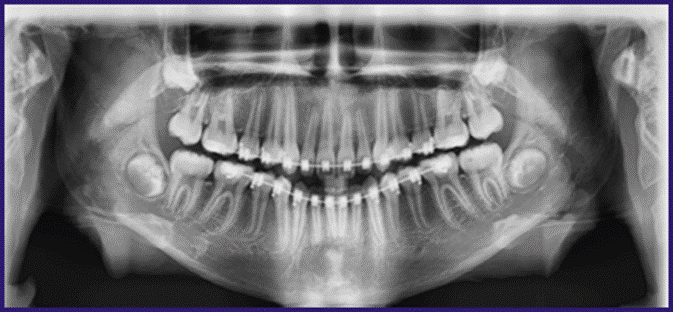 Durante el tratamiento, se observó en la radiografía de control cómo la raíz continuó creciendo, con posterior cerrado apical y alargamiento radicular (Figura 3). Se finalizó con el uso de elásticos intermaxilares 1/8” heavy para asentamiento y contención fija superior e inferior. Se obtuvo una evolución favorable para el manejo de un caso bastante complejo.