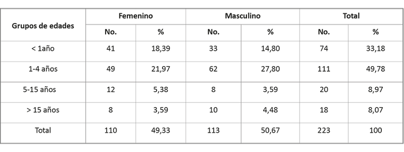 En la Tabla 1 se aprecia que, del total de pacientes estudiados, el 50,67 % pertenecían al sexo masculino, que fue el predominante, aunque con muy poca diferencia respecto al número de pacientes femeninos. Los niños menores de 5 años representaron el 83,56 % de la muestra, y menos de la mitad de ellos eran lactantes. Fallecieron 2 casos con edades entre 1 y 2 años por shock séptico y disfunción múltiple de órganos.