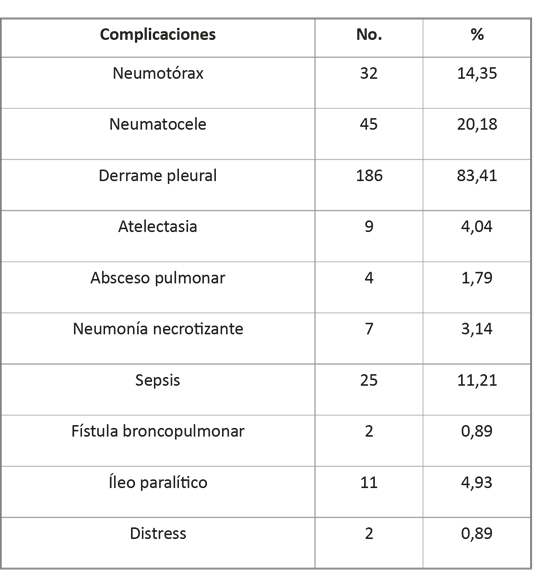 La Tabla 2 muestra que las principales complicaciones encontradas fueron el derrame pleural, que se presentó en un 83,41 % de los casos, seguidos del neumatocele y el neumotórax. La sepsis en sus diferentes estadios fue la principal complicación extrapulmonar, de ella, 8 pacientes (3,59 % de la muestra) llegaron al shock séptico.