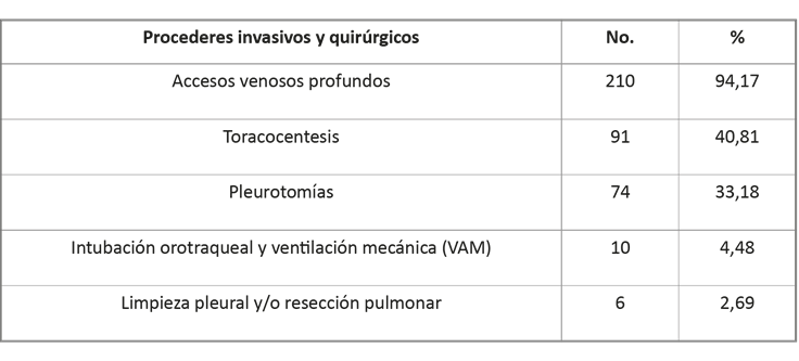 Procederes invasivos y quirúrgicos realizados: accesos venosos profundos, toracocentesis, pleurotomía, intubación orotraqueal y ventilación mecánica, limpieza pleural y/o resección pulmonar.