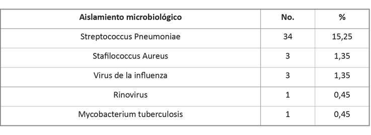 Aislamiento microbiológico: Streptococcus pneumoniae, Stafilococcus aureus, Virus de la influenza, Rinovirus, Mycobacterium tuberculosis