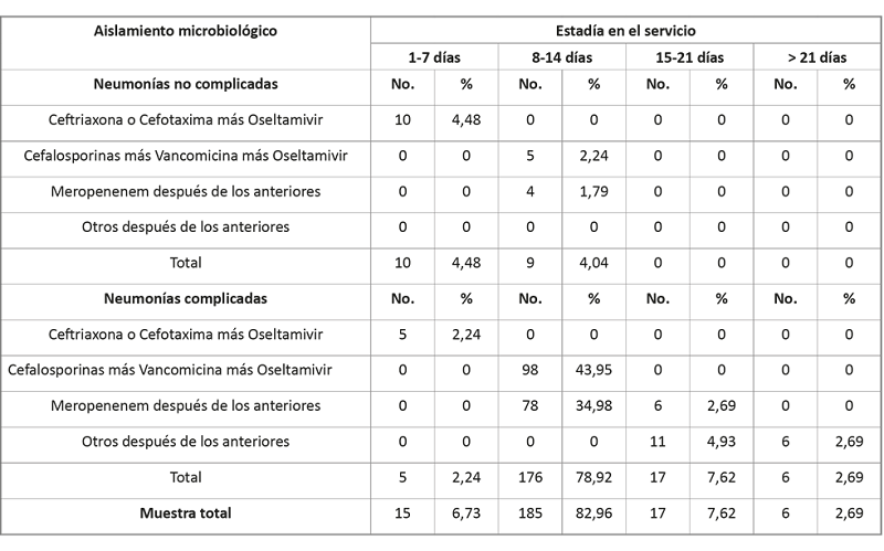 Teniendo en cuenta el protocolo de tratamiento de las neumonías graves o complicadas, se aplicó antibioticoterapia en el 100 % de los casos estudiados; sólo un antibiótico en el 6,73 % de los casos y, en el resto, se requirió asociar otro o más antibióticos, directamente relacionado con la evolución de los pacientes, lo que también influyó en la estadía de estos en el servicio, como describe la Tabla 5. Se trataron con cefalosporinas de tercera generación la totalidad de los pacientes inicialmente y la mayoría tuvo una estadía de 8 a 14 días.