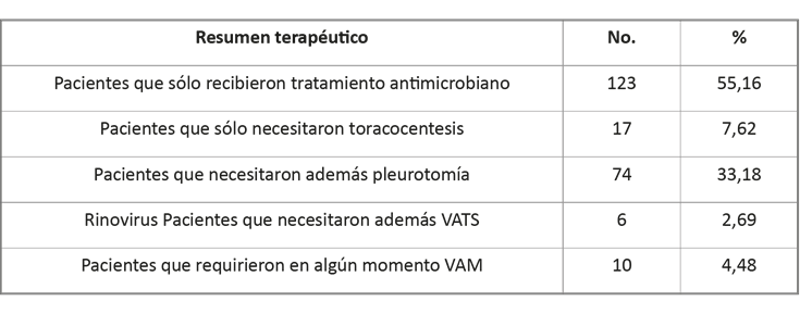 En la experiencia del servicio donde se realizó este trabajo, el empleo de la combinación de antibióticos con toracocentesis o pleurotomía cuando se requirió, con o sin fibrinolíticos, resultó muy eficaz en la resolución de los DPP complicados. Sólo se realizaron otras técnicas quirúrgicas en menos del 3 % de la muestra, lo que correspondió al 8,11 % de los pacientes con drenaje torácico. También se realizaron otros procederes invasivos como la ventilación mecánica por otras complicaciones de las neumonías en el 4,48 % de los casos.