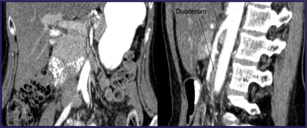 Paciente femenina de 49 años de edad, hipertensa, con dos cirugías abdominales previas (histerectomía y laparoscopía). Refiere pérdida de peso después de quimioterapia secundaria a cáncer ginecológico e historia de náuseas postprandiales, vómitos y dolor abdominal de 2 años de evolución. Hospitalizaciones anteriores para corrección de trastornos hidroelectrolíticos y para alimentación parenteral. Ingresó en otra institución para realización de tratamiento quirúrgico laparoscópico (fallido). Se realizó TAC de abdomen con doble contraste endovenoso y por vía oral; se confirmó el diagnóstico (compresión extrínseca a nivel del duodeno distal, ángulo aortomesentérico de 7° y distancia aortomesentérica de solo 5,3 mm). También se comprobó la pérdida del plano graso que ocupa el espacio aortomesentérico. (Figura 1).