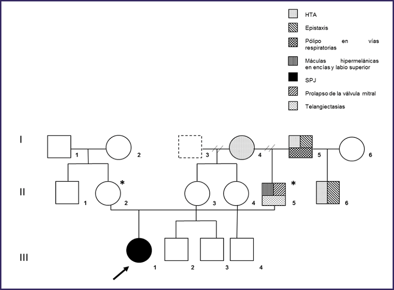 Paciente masculino de 36 años de edad con antecedentes de prolapso de la válvula mitral que acude a consulta de genética clínica con su esposa para solicitar asesoramiento genético, debido a que tienen una hija con diagnóstico de Síndrome de Peutz-Jeghers y desean conocer el riesgo de tener otro hijo afectado. Como antecedentes familiares de interés al abuelo paterno del propósito se le diagnosticó de forma incidental un pólipo benigno en vías respiratorias a la edad de 58 años (no hay evidencia documental de su histología). Un tío y abuelo paterno son hipertensos y han presentado epistaxis ocasionalmente (Figura 1).14