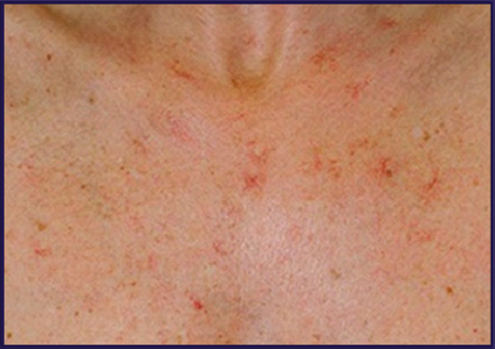 Las telangiectasias son dilataciones anormales de los vasos terminales del plexo subpapilar en la dermis superficial que son visibles como pequeñas lesiones de color rojo púrpura en la piel y las membranas mucosas.10,11 Pueden estar asociadas a enfermedades hereditarias o ser secundarias a enfermedades sistémicas.10