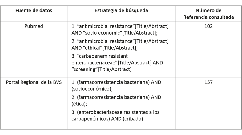 Se realizó una revisión de fuentes bibliográficas que fueron localizadas mediante la base de datos Pubmed y Portal Regional de la Biblioteca Virtual de Salud y el motor de búsqueda Google Académico con los descriptores en español e inglés: “farmacorresistencia bacteriana” combinado con “socioeconómico” y “ética”, respectivamente, y “Enterobacterias resistentes a carbapenémicos” combinado con “cribado” (Tabla).