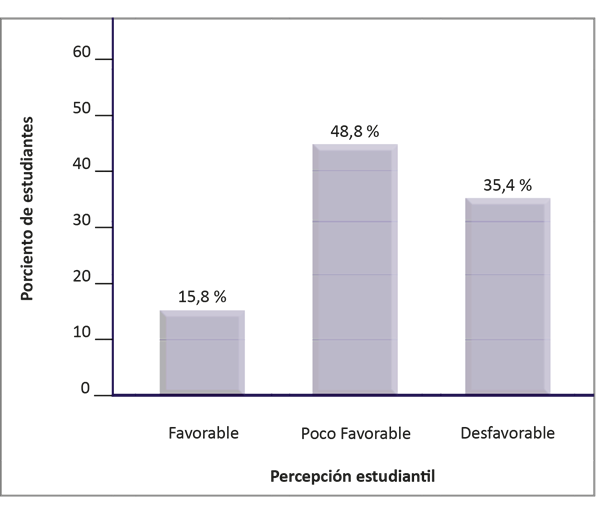Por otro lado, la percepción estudiantil poco favorable se evidenció en el 22,0 % y 18,3 % de los estudiantes que cursan el 5to y 4to años, respectivamente. Asimismo, el 19,6 % de los que cursan el 3er año, la perciben como desfavorable.