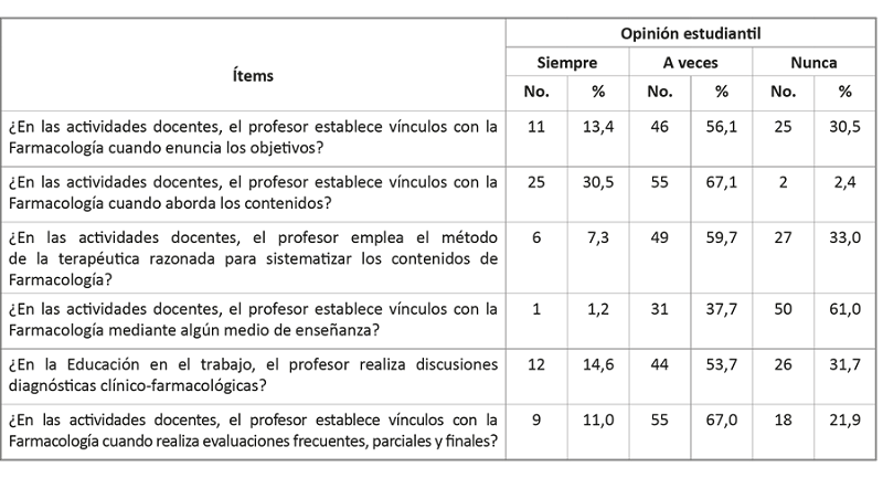 Results: The student opinion of interdisciplinary relationships with Pharmacology through the didactic components showed a predominance of the response alternative "sometimes" in five items; the expected proportion of favorable student perception was 15.8%.