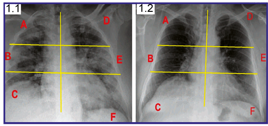 The demographic input variables used included: age measured in completed years, then converted into qualitative, divided into age group 20-30, 31-40, 41-50, 51-60, 61-65. Gender: female or male. Nutritional status for which the body mass index (BMI) measured in kg / m2 was used, then characterized according to the WHO as: underweight <18 kg / m2, normal 18-24.9 kg / m2, overweight 25- 29.9 kg / m2, obese 30-39.9 kg / m2 and morbid obesity more than 40 kg / m2. Leukogram according to its value and converted into qualitative, dichotomized: normal between 4x103 u/L and 10x103 u/L or abnormal <4x103 u/L > 10x103 u/L. Comorbidities divided into absence of comorbidities, presence of one comorbidity, and presence of two comorbidities. Specific comorbidities (diabetes, high blood pressure [HBP]). The severity index of the initial chest X-ray (CSE) which was divided into 6 quadrants using vertices, bases, and hila as limits.15 It was dichotomized in 0-1 quadrant affected or 2-6 quadrants affected, based on the amount of affected quadrants by condensation or some radio-opacity detected in the initial chest x-ray. (Figure 1)