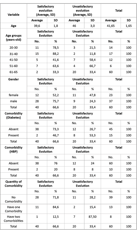 The sample consisted of 60 patients who met the eligibility criteria. There was no exclusion in the calculations due to loss data. The average age of the sample was 41.65 years. The average age of the patients with unsatisfactory evolution was 46 years and 39.6 for the other group.