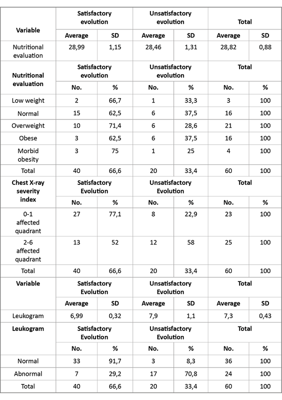 The results of the univariate analysis are shown in tables 1 and 2. Advanced age, female sex, being diabetic, hypertensive, having two comorbidities (diabetes, HBP), nutritional status, overweight, and the involvement of 2-6 quadrants in the first chest X-ray and abnormal leukogram were the most frequent findings in patients with unsatisfactory evolution due to the severity of the infection.