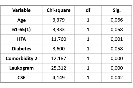In the bivariate analysis, the progressive increase in age, the age group 61-65 years, suffering HBP, diabetes, having 2 comorbidities, the abnormal leukogram, and the chest X-ray severity index (CSE) resulted with statistical significance. (Table 3)