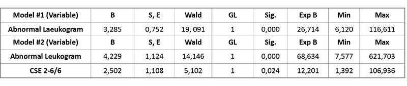 In the multivariate analysis, two models with statistical significance were obtained, each with the following interpretation. In model 1, only the leukogram with an abnormal value compared to normal is evaluated and the probability of complications is 26,714 times. In model 2, after a goodness adjustment, the abnormal leukogram variable compared to normal and the CSE of 2-6 / 6 compared to 0/6, increase the chances of complication by 68,634 and 12,201 times respectively when they are associated in the same patient; the other resulting models lacked significant p values. (Table 4)