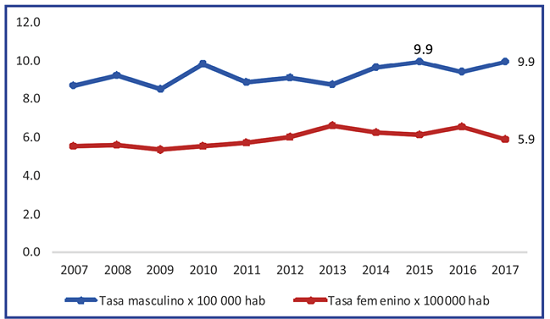 Se presentaron tasas de mortalidad, según el sexo, estables durante este período de tiempo; fueron más altas para el sexo masculino con un total de 5 710 fallecidos tasa de 9,9 X 100 000 habitantes, dando una relación hombre mujer de 1,5:1, la mayor tasa en hombres fue en los años 2015 y 2017 con 9.9 X 100 000 habitantes. El reporte de tasa de mortalidad más baja para ambos sexos fue en el año 2009. (Figura 1).