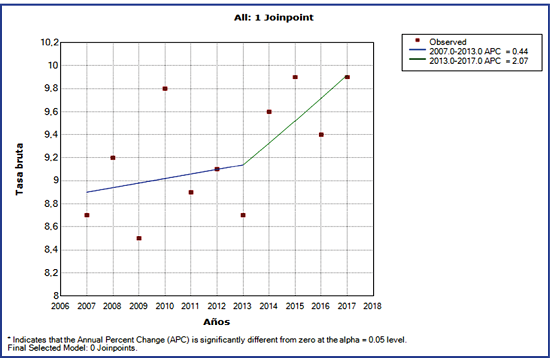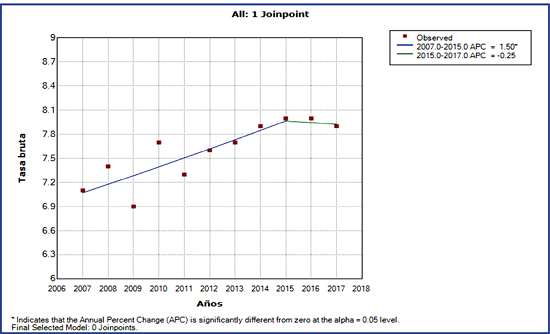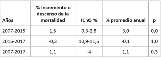 La Tabla 2 instaura los años en que la tendencia de la mortalidad presentó un ascenso estadísticamente significativo en el período comprendido entre los años 2007-2015 incrementó en 1,5 % (p=0,0), y un descenso de la mortalidad en el último período 2016-2017 de 0,3 %. El porcentaje promedio anual de cambio (AAPC) es ascendente, con valor 1,1 % estadísticamente significativo p=0,3.